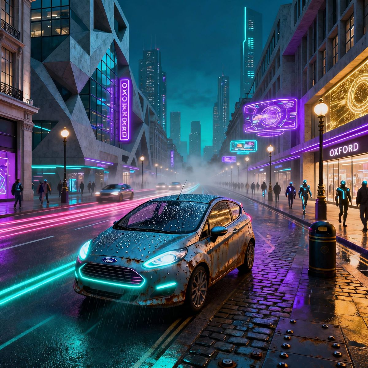 This image shows a photorealistic view of Oxford Street, London, in 2100. Towering Constructivist buildings and vibrant, energetic lighting illuminate the busy avenue at night, highlighting glowing car lights.