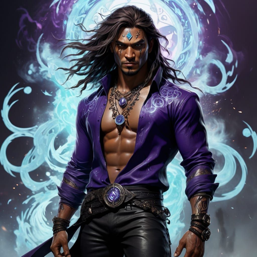 This image depicts a Native American and Korean warlock standing amidst a whirlwind of magic, with intricate symbols etched into his skin and vibrant, electric colors surrounding him. The warlock's dark, glistening skin and toned physique are showcased in a dramatic, cinematic scene.
