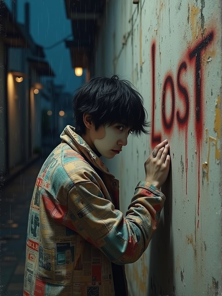 A haunting mixed media portrait of a young man hiding in a dark alley, his face concealed by a porcelain mask, amidst a distressed urban backdrop, with visible textures and artistic flair reminiscent of avant-garde masters.