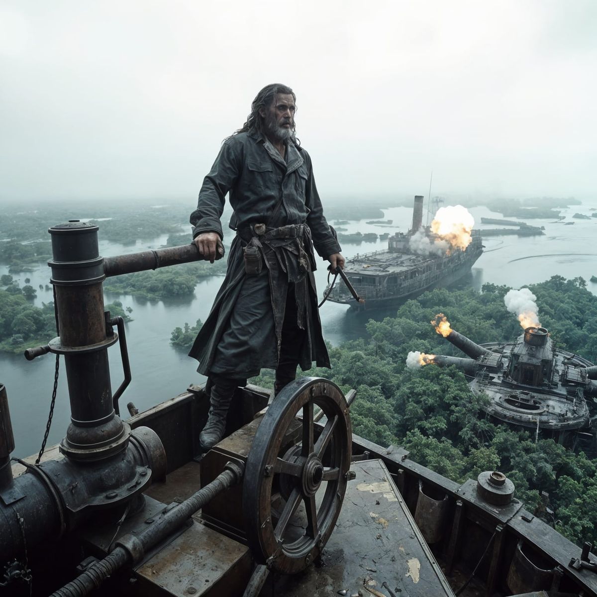 A dramatic scene of a steamboat fleet in a post-apocalyptic Louisiana, overgrown with vines and vines, featuring a steampunk engine and intricate details.