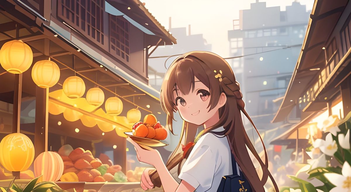 This image captures a serene moment of a young Thai girl walking through a bustling Bangkok floating market, surrounded by vibrant colors and exotic fruits. Her long, dark brown hair is adorned with delicate white flowers, and a warm golden light illuminates her smiling face, set against a softly focused...