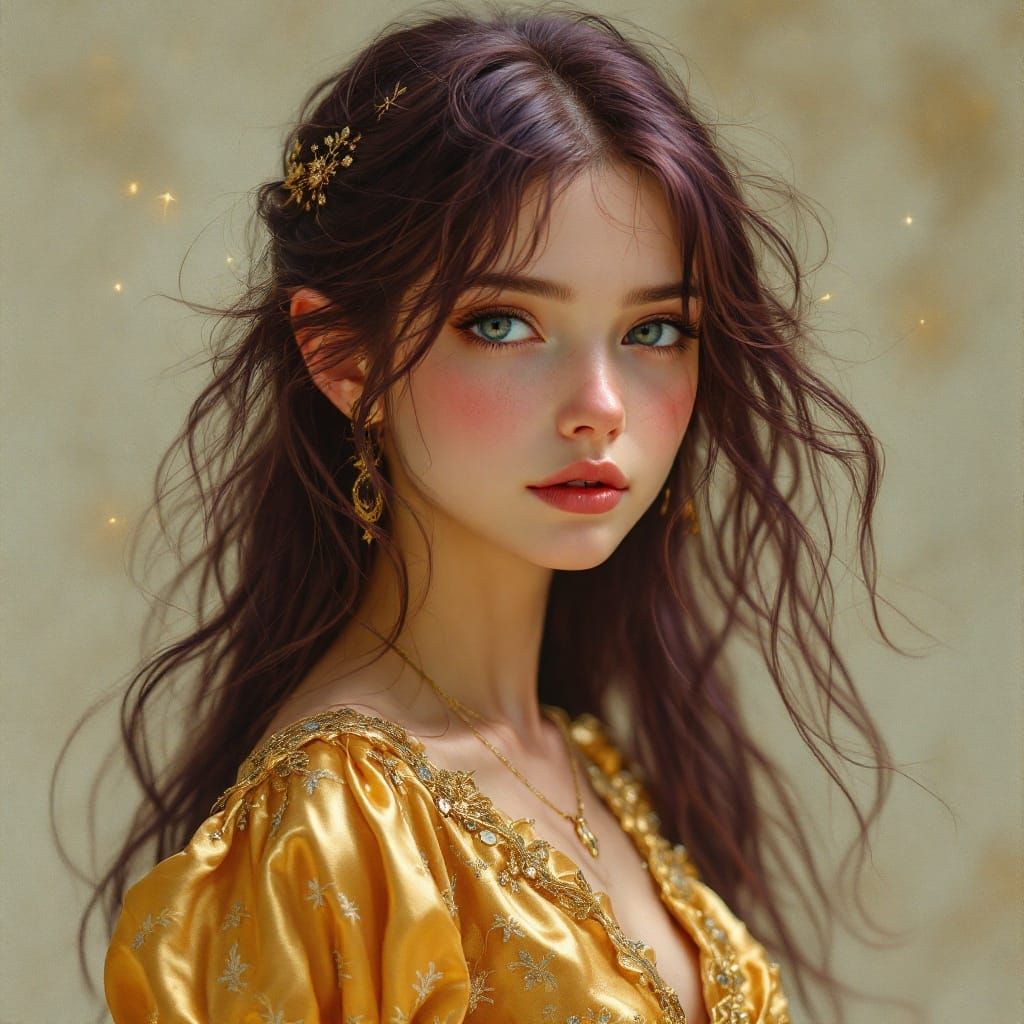 This enchanting image depicts a delicate halfling maiden surrounded by a soft, ethereal glow, adorned in a stunning gold silken gown with intricate embroidery, reminiscent of romantic watercolor paintings and mystical fantasy art.