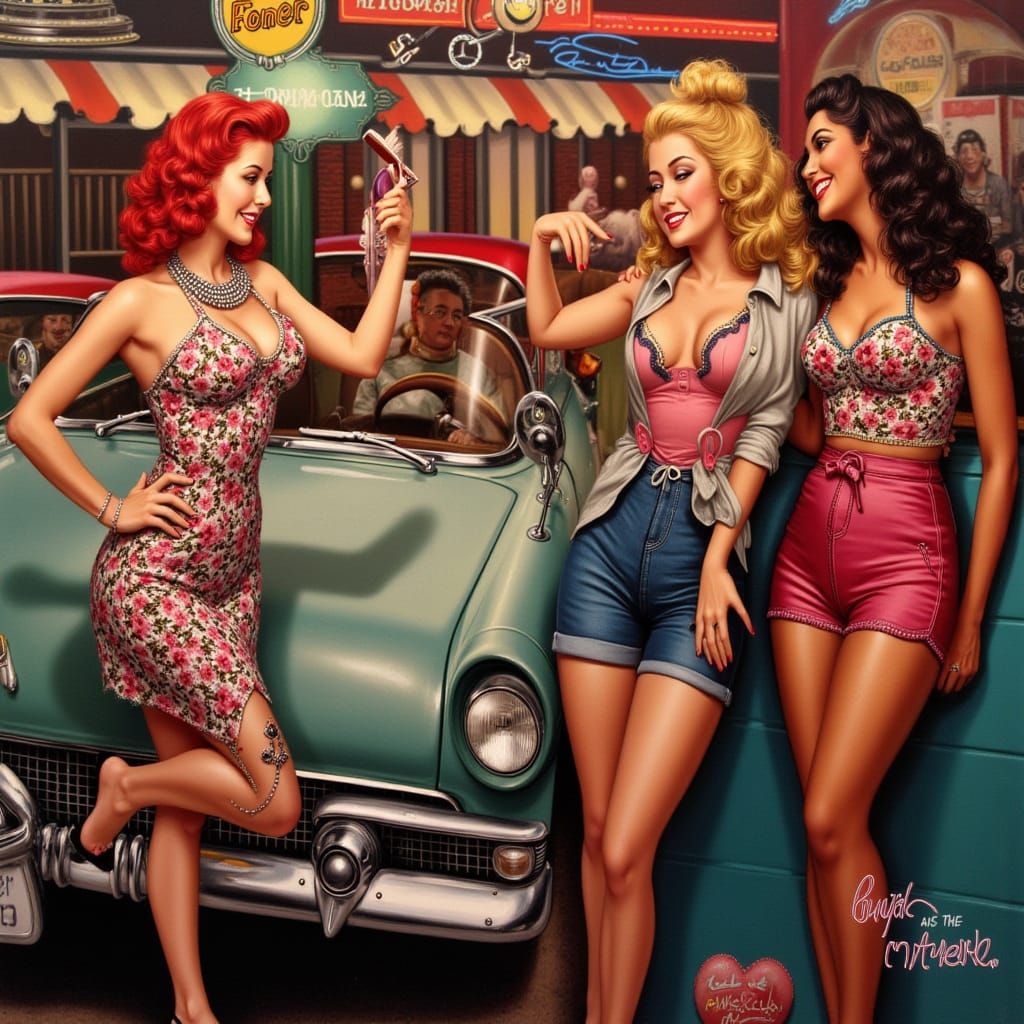 A vibrant scene of women in their 30s and 40s embracing body positivity in glamorous 1940s-50s pin-up fashion. They laugh and pose confidently in a retro diner setting.