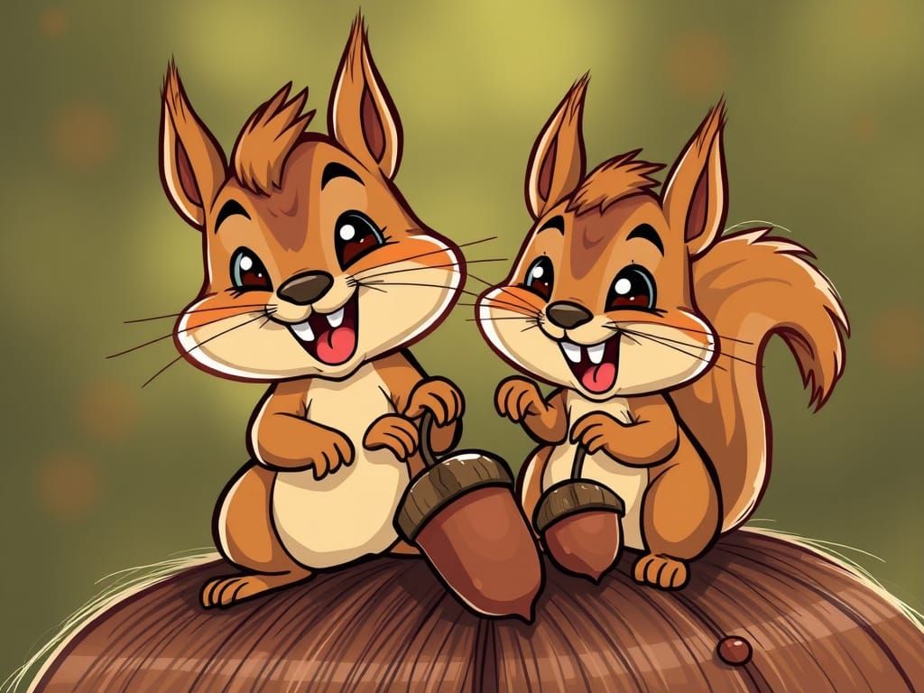 This image depicts two cartoon squirrels with prominent buck teeth playfully dropping acorns onto people's heads. The artwork is colorful and humorous.
