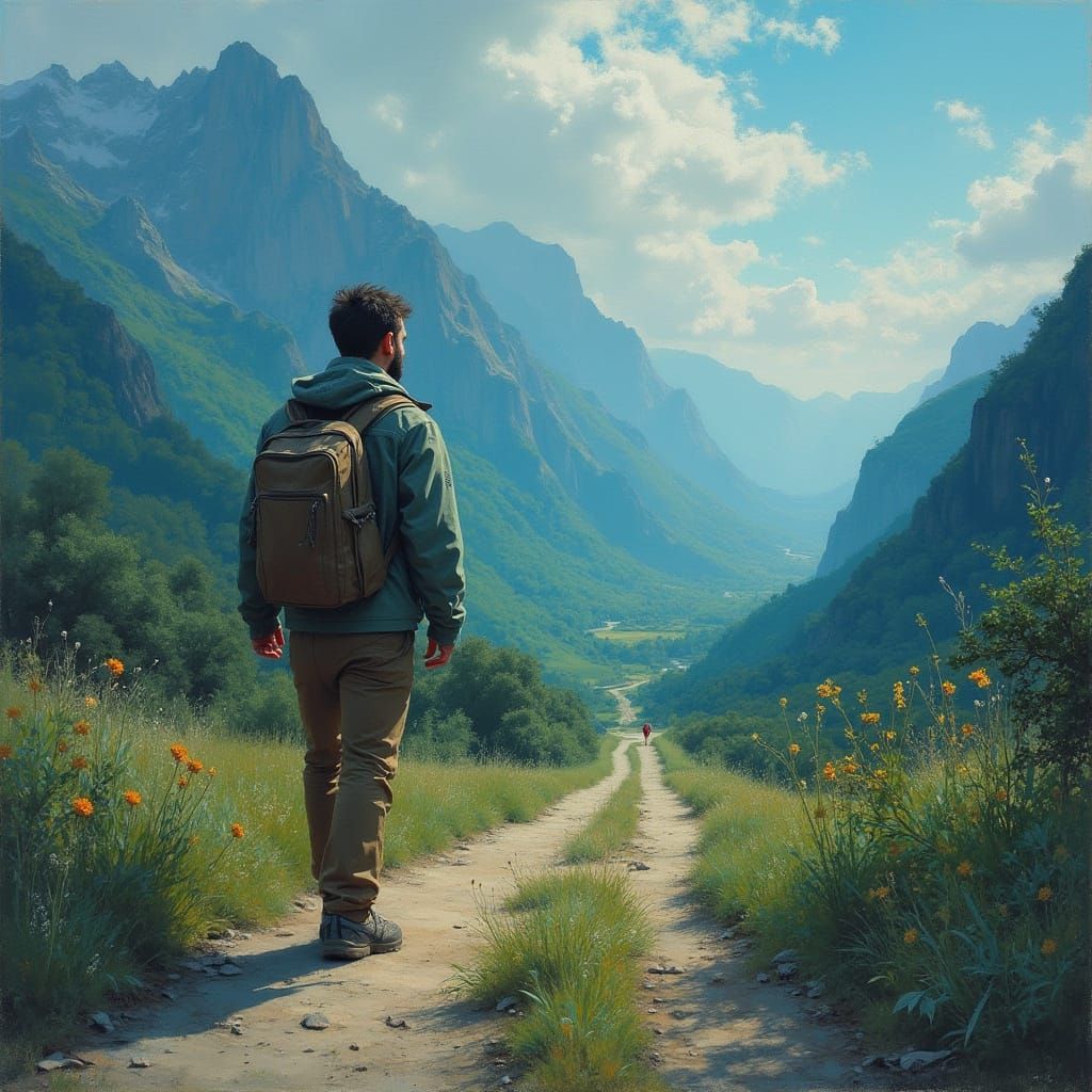 "Un viajero contemplativo, fusionado con paisajes enhiestos y bravรญos, envuelto en tonos cambiantes de la naturaleza. Su rostro refleja una suma de contrarios, con sombras y luces que se entremezclan. Su mirada es profunda, mostrando un alma en constante evoluciรณn. Se conjuga en presente, con un aura vibrante y llena de vida. El fondo es un sendero onรญrico que representa un viaje interior, con matices de lo desconocido y lo familiar. Estilo surrealista e impresionista, con texturas suaves y detalles etรฉreos."