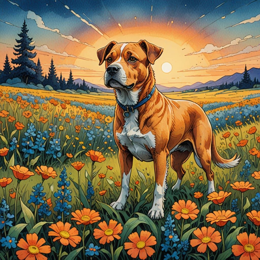 This concept art features a peculiar dog amidst a field of flowers, illuminated by sunset light. The artwork blends watercolor washes with gouache highlights, reminiscent of comic art.
