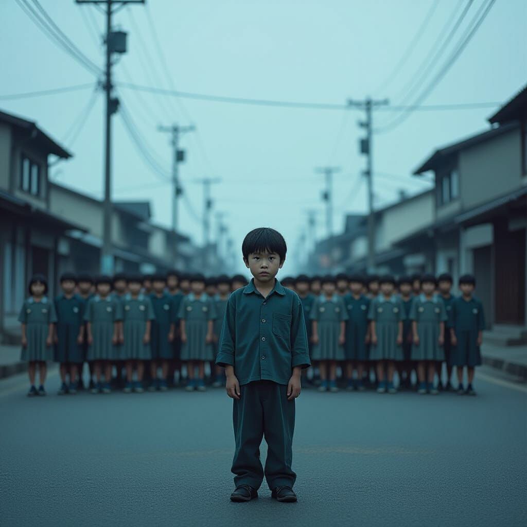 This image shows dozens of children with black eyes silently pointing in a deserted street. Shot on 35mm film, the cinematic scene evokes the moody lighting of Akira Kurosawa.