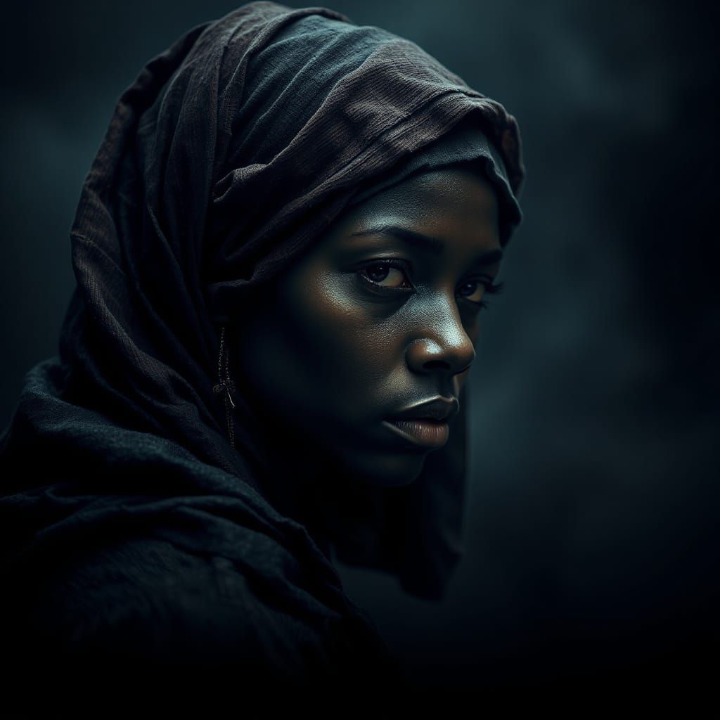 This image shows a mysterious woman with a villainous expression in a dark fantasy portrait. The artwork features dramatic lighting, meticulous detail, and photorealistic textures using a dark, gothic realism style.