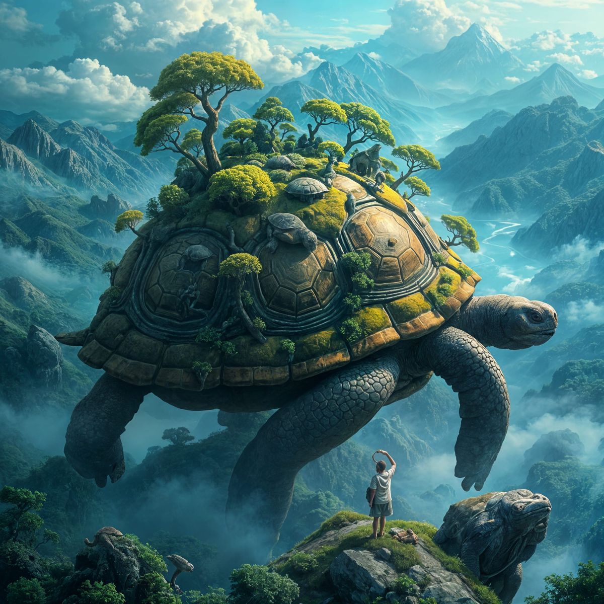 This image depicts a mystical world on the back of a giant tortoise, teeming with lush vegetation and vibrant landscapes.
