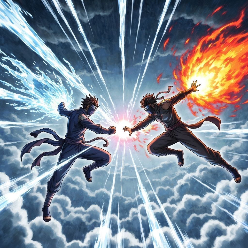 This image depicts two rival anime ninjas in a dynamic aerial battle, unleashing water and fire attacks. Rendered in a vibrant, high-contrast anime style with cinematic lighting.