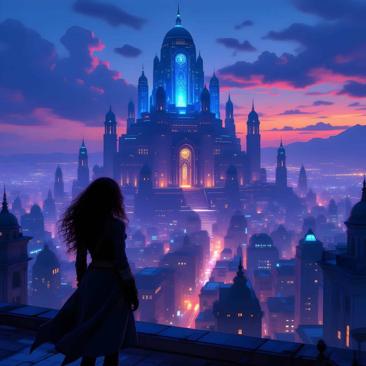 A lone explorer on a rooftop gazes at a neon metropolis at dusk, featuring a glowing ancient library. Rendered in a hyperrealistic digital matte painting style.