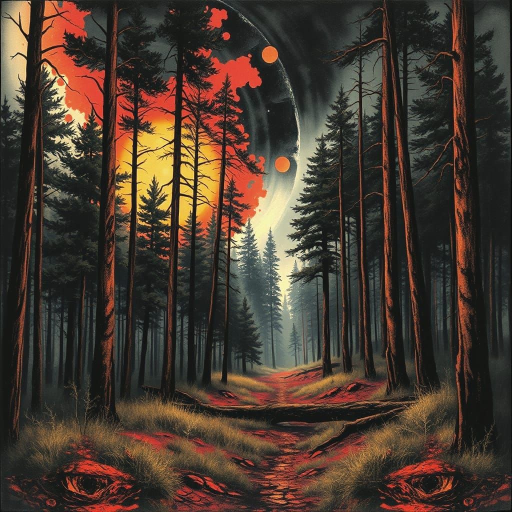 An eldritch, high-contrast scene of an abandoned pine forest with a cosmic horror theme. Rendered with ink and oil on paper techniques, evoking a dark, unsettling atmosphere.