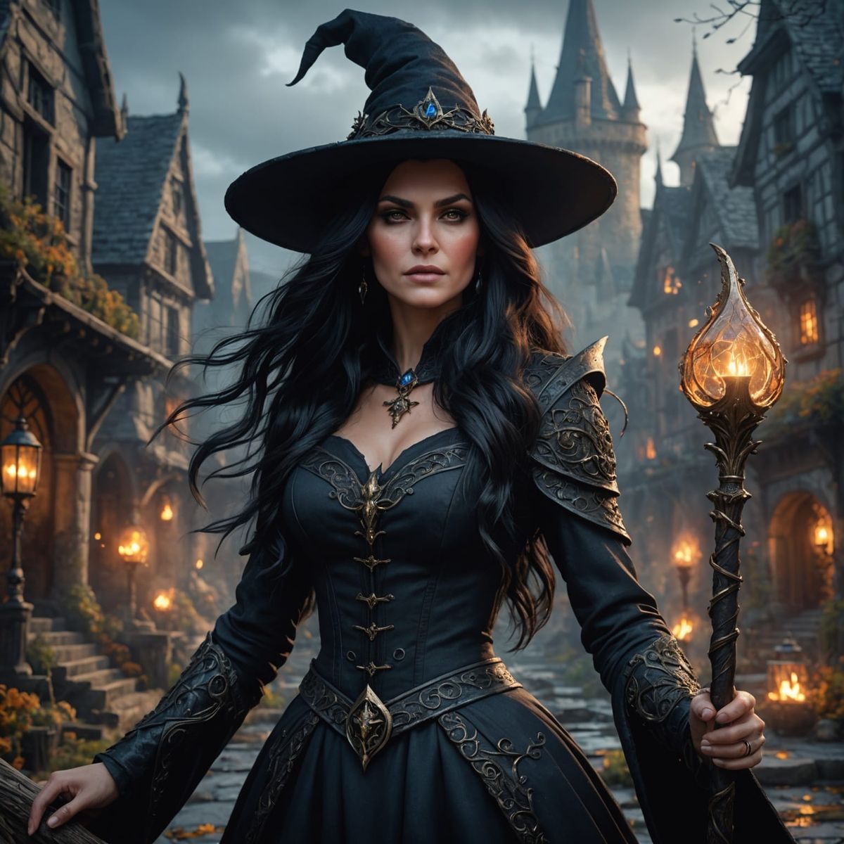 A striking picture of a beautiful witch with long black hair. This highly detailed digital matte painting features deep, rich colors and fantastical elements, rendered in 8k resolution.