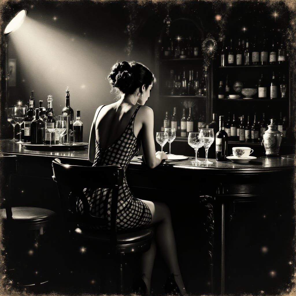 This image shows a woman in a vintage checkered dress at a mahogany bar, with antique bottles and glasses. Rendered in alcohol charcoal with soft lighting and a warm color scheme.