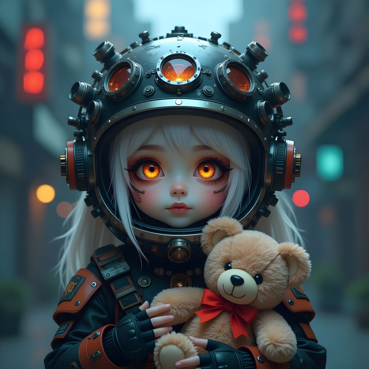 A young girl with wide-set, glowing eyes holds a teddy bear. She wears a detailed space helmet with wires and lenses, blending emo, goth, and steampunk styles in a dark, neon-lit cyberpunk setting.