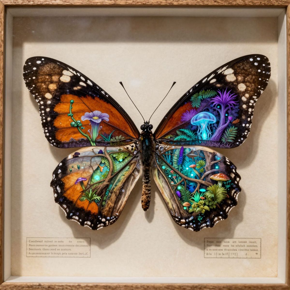 This intricate botanical illustration features a pinned monarch butterfly. One wing reveals a detailed alien rainforest biome, complete with bioluminescent flora and glowing creatures.