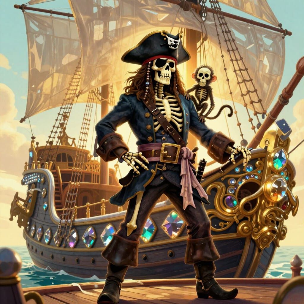 This image shows a skeletal pirate captain with a monkey companion on a diamond ship during golden hour. The art style is detailed concept art with a vibrant, jewel-like color palette.