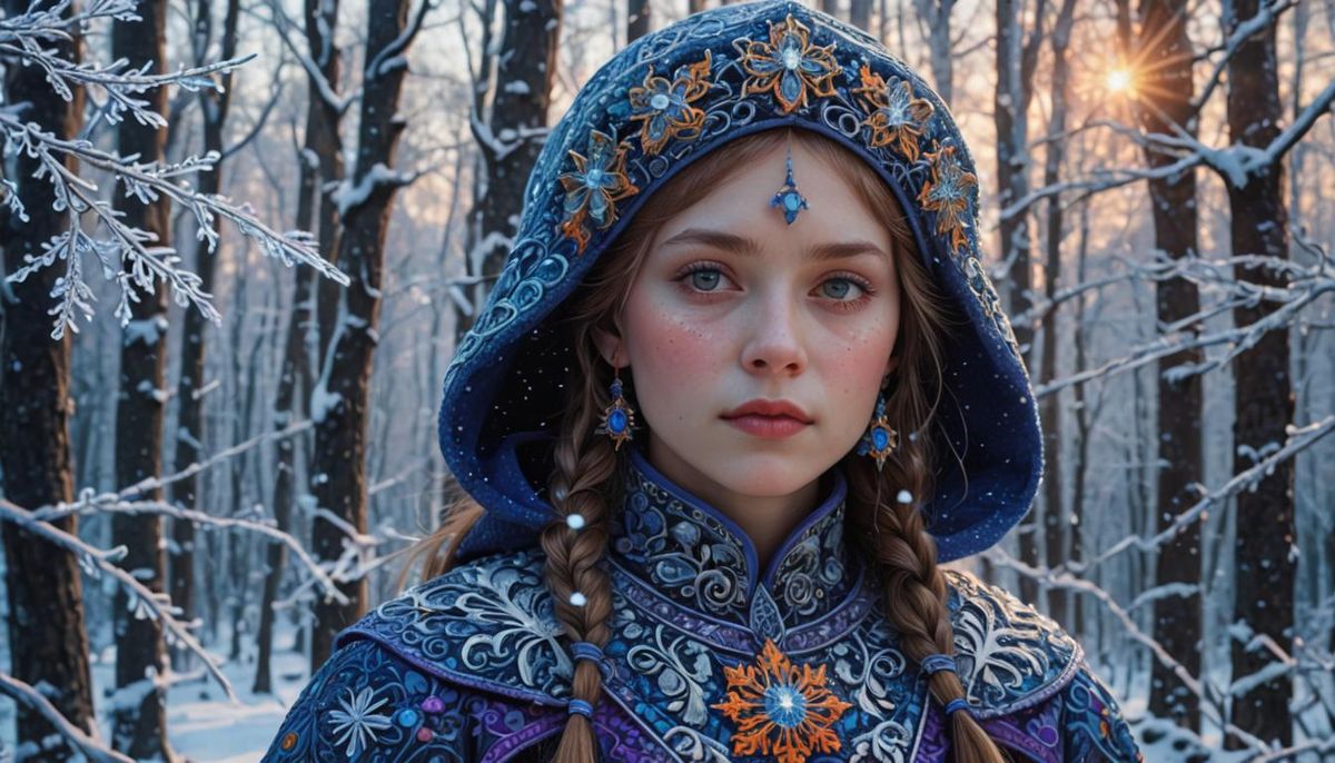 A digital matte painting of a mystical snow maiden in a forest. The artwork features rich, vibrant colors, intricate patterns, and a sparkling, frosty atmosphere, inspired by Russian folklore.