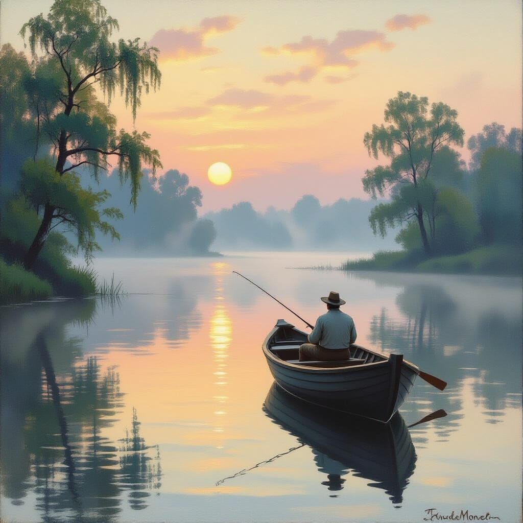 This image captures a serene dawn on a misty lake with a lone fisherman in a rowboat. The scene features soft pastel colors, reflections, and ancient trees, rendered with loose brushstrokes focusing on light and atmosphere.