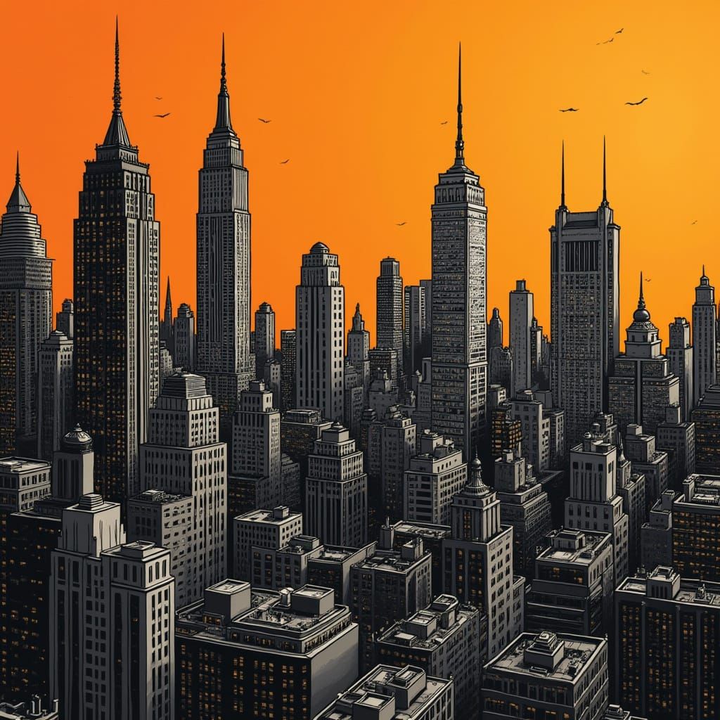 A detailed comic illustration of the New York City skyline from Central Park, rendered in black and orange with influences of cubism and stark architectural forms.