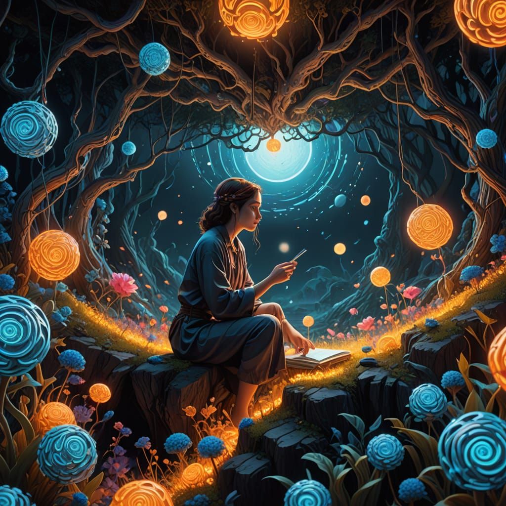 This artwork showcases a captivating transition from intricate hand-drawn illustration to a hyper-realistic 3D environment, featuring striking dimensional contrast and ethereal lighting.