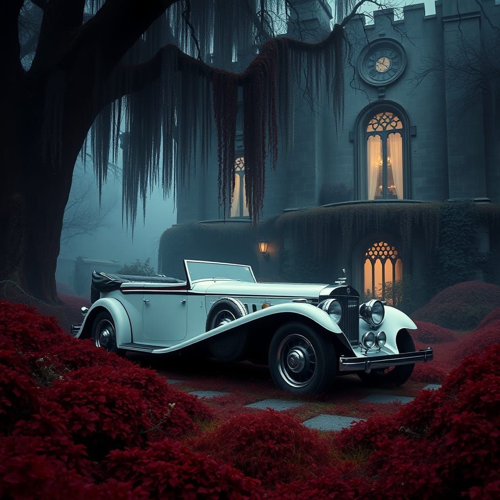 This image depicts a futuristic yet nostalgic scene in a weathered country manor, featuring a sleek 1929 Pierce-Arrow amidst overgrown grounds, ivy, and moss, with a stylized high-contrast geometric design and Baroque blue watercolor accents.