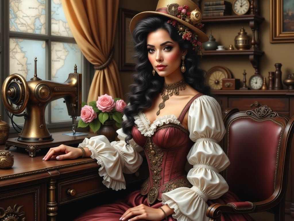 An oil painting of a beautiful Puerto Rican seamstress in a steampunk outfit, working at a desk with a steampunk sewing machine. Hyperdetailed artwork.