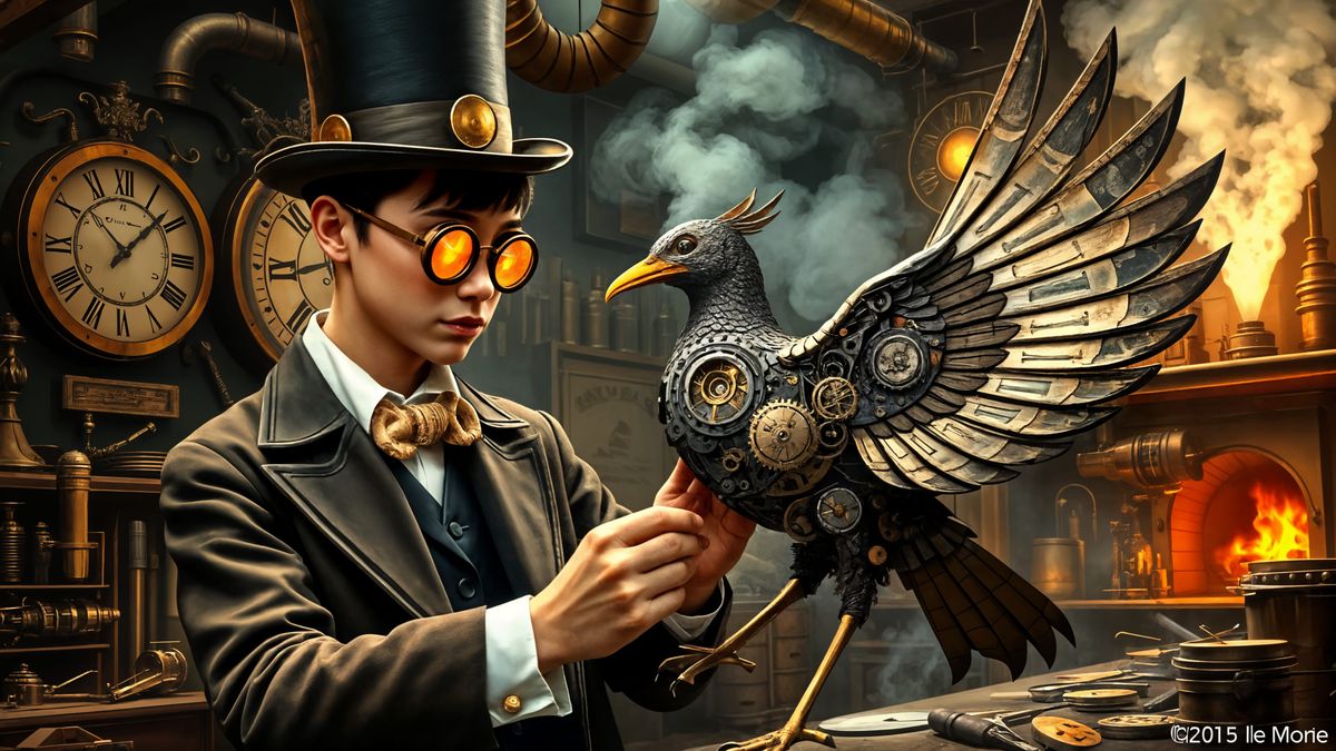 A detailed image of a young inventor in a steampunk workshop, carefully assembling a mechanical bird. The scene is filled with brass gadgets, ornate clocks, and glowing furnaces in a steampunk aesthetic.