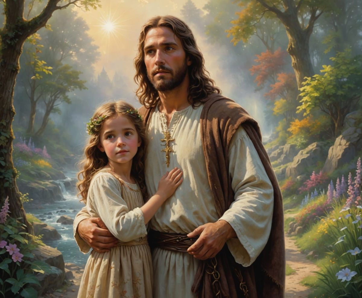 This image shows a hyper-realistic depiction of Jesus carrying a young girl, surrounded by an ethereal mist. The scene is captured in close-up, with a focus on the tender moment between Jesus and the child.