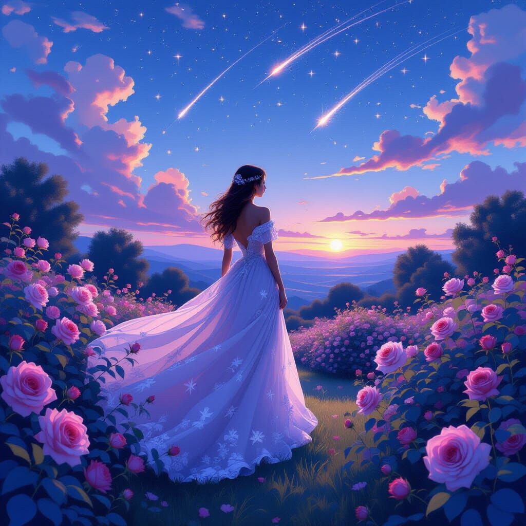 This image shows a woman in a star-covered gown in a celestial garden. Twilight roses bloom under a lavender sky streaked with shooting stars, rendered with art nouveau elegance.