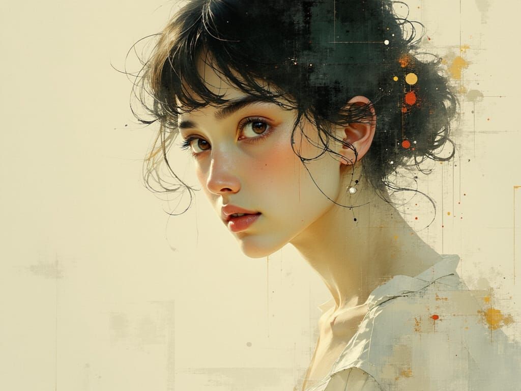 This image features a photorealistic portrait of a woman with gentle eyes, blending cubist fragmentation with evocative brushwork in a soft pastel palette.