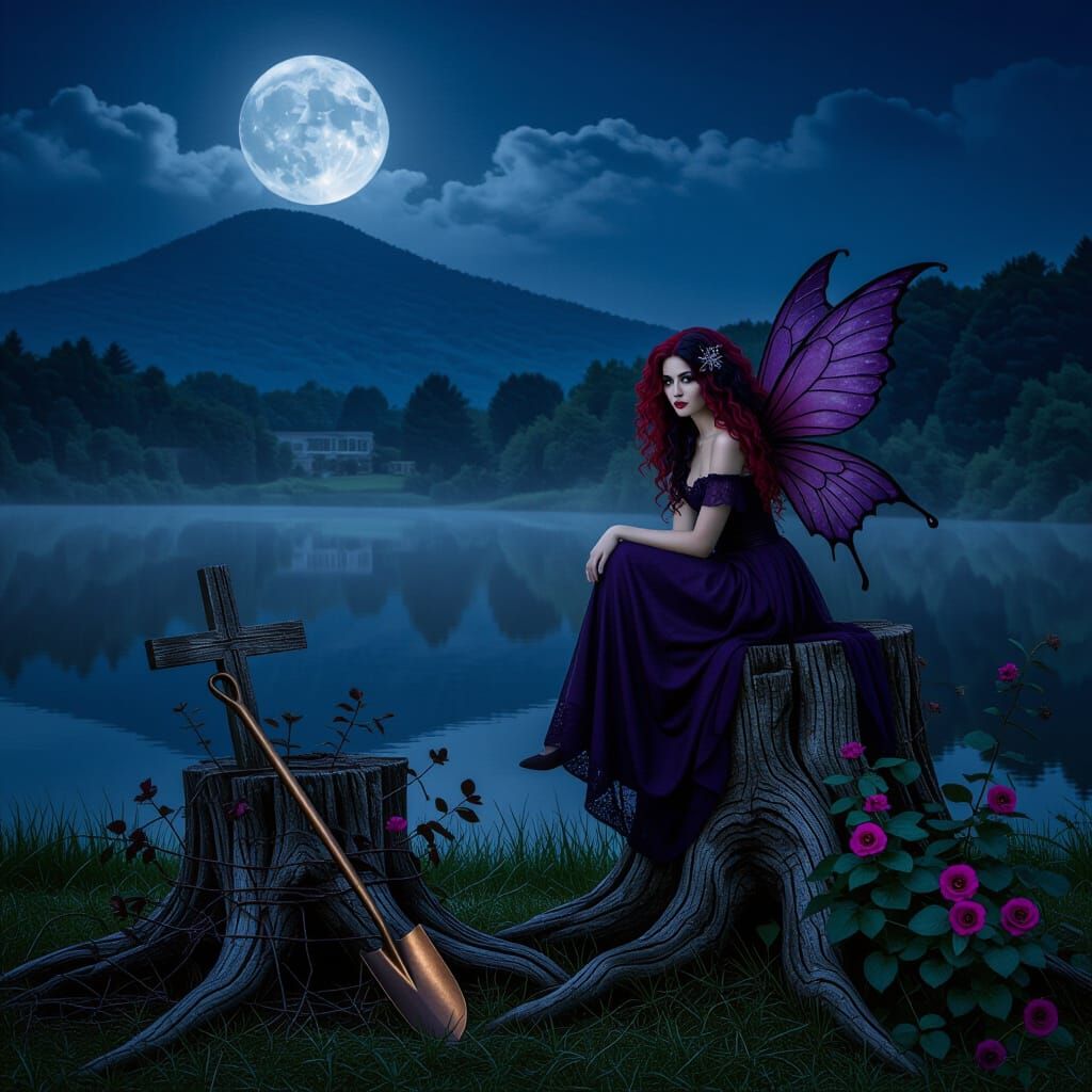 This image showcases a seductive fairy with red and black hair on an ancient oak stump. A mystical night scene features a reflective lake, rural mountains, and a wooden cross amidst dark fantasy blooms.