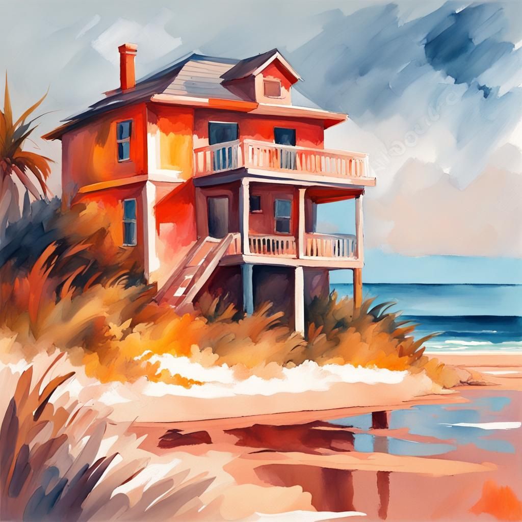A vibrant image depicting a beachfront house in an abstract style. The color palette is warm and inviting, reminiscent of Gouache and watercolor techniques, with thick brush strokes adding texture.