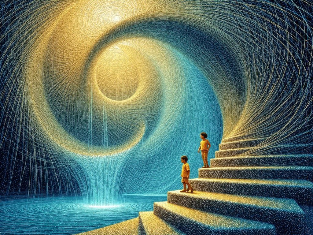 Image shows two boys walking down a golden threaded staircase into a cave. They look in wonder as a waterfall spills into the turquoise pool below.