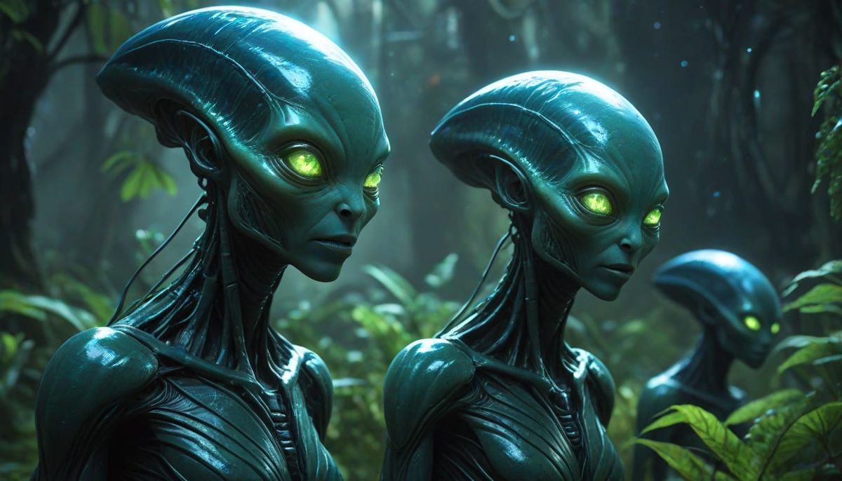 This sci-fi concept art depicts short, light-haired humanoids with pointed ears and large, glowing green eyes reflecting starlight. Bioluminescent plants and ethereal light create a sense of alien wonder.