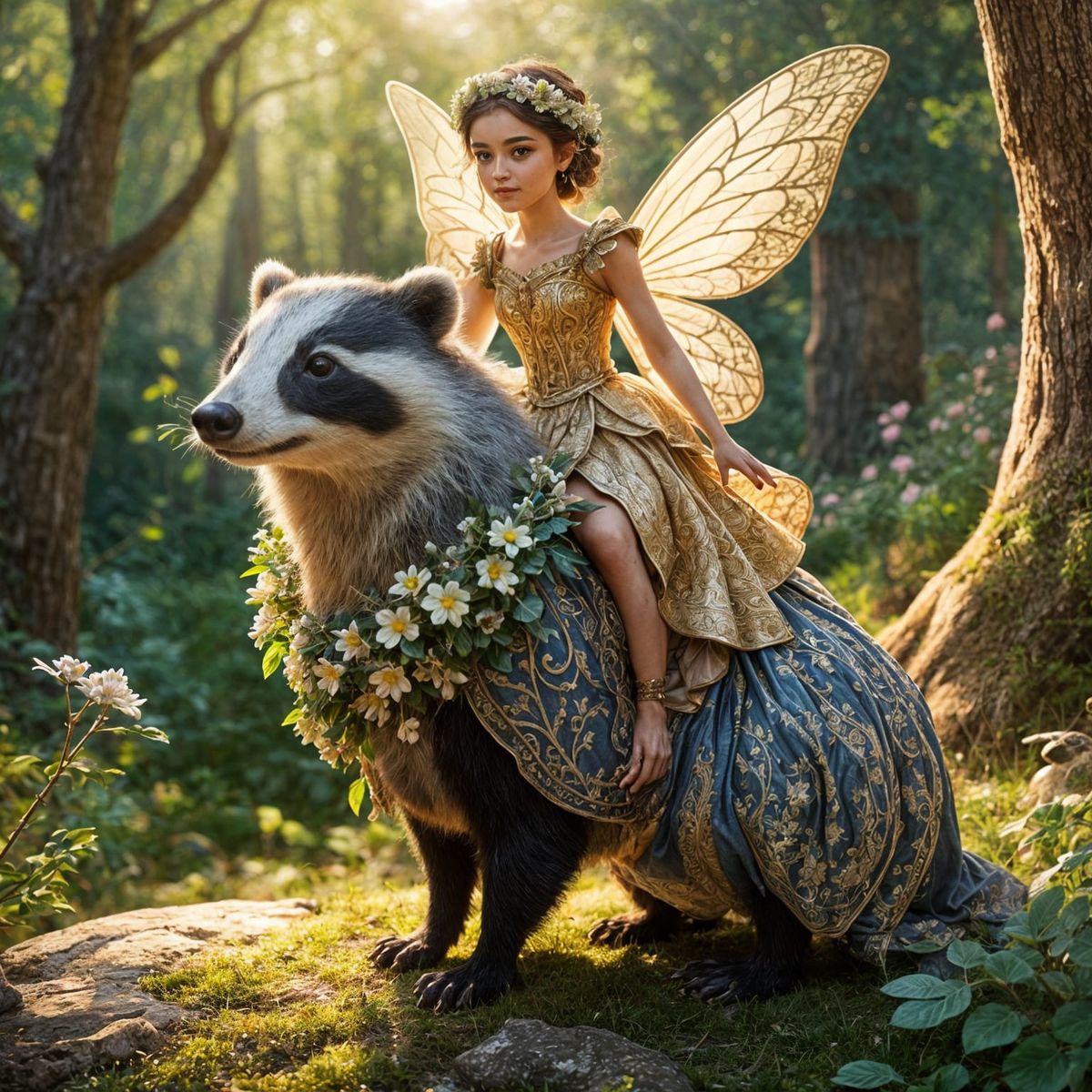 This image shows a beautiful woman with intricate hair and a Greek dress riding a cute badger through a detailed setting. The hyperrealistic rendering creates a sweet, photorealistic scene.