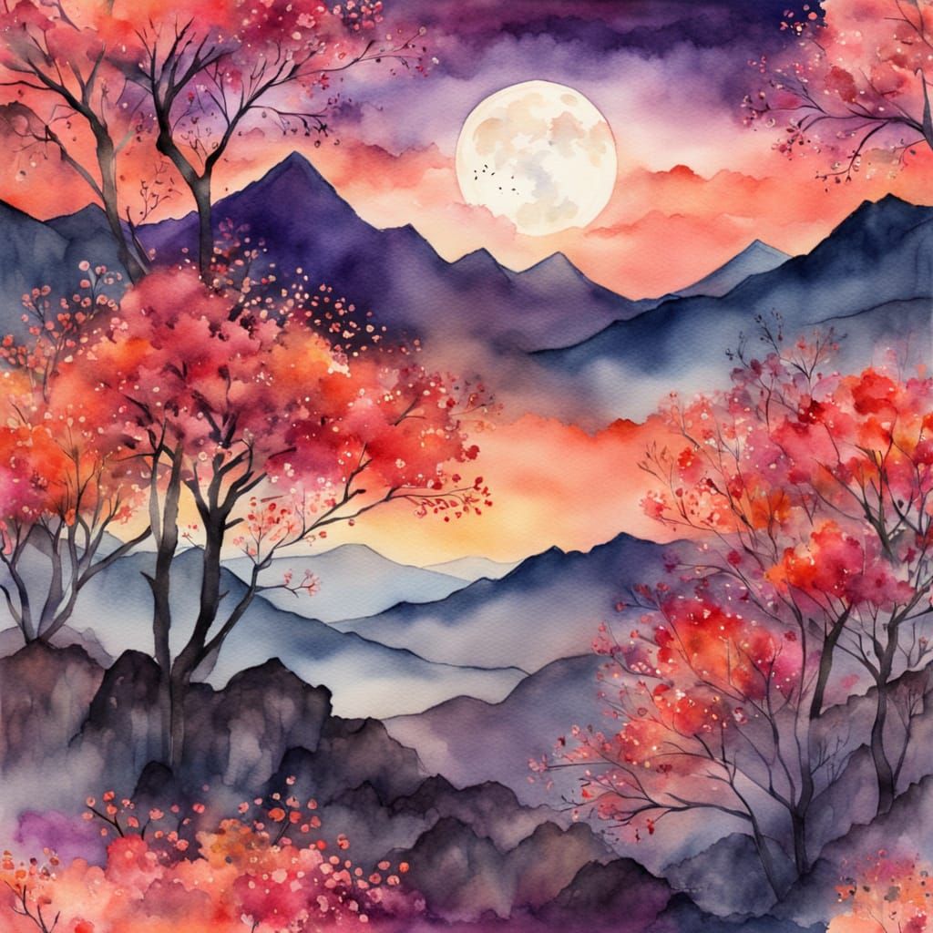 This image showcases a vibrant, detailed watercolor landscape featuring a full moon, red blossoms, and a sunset over rocky mountains. It evokes a serene, atmospheric mood with delicate washes of color and dramatic twilight hues.