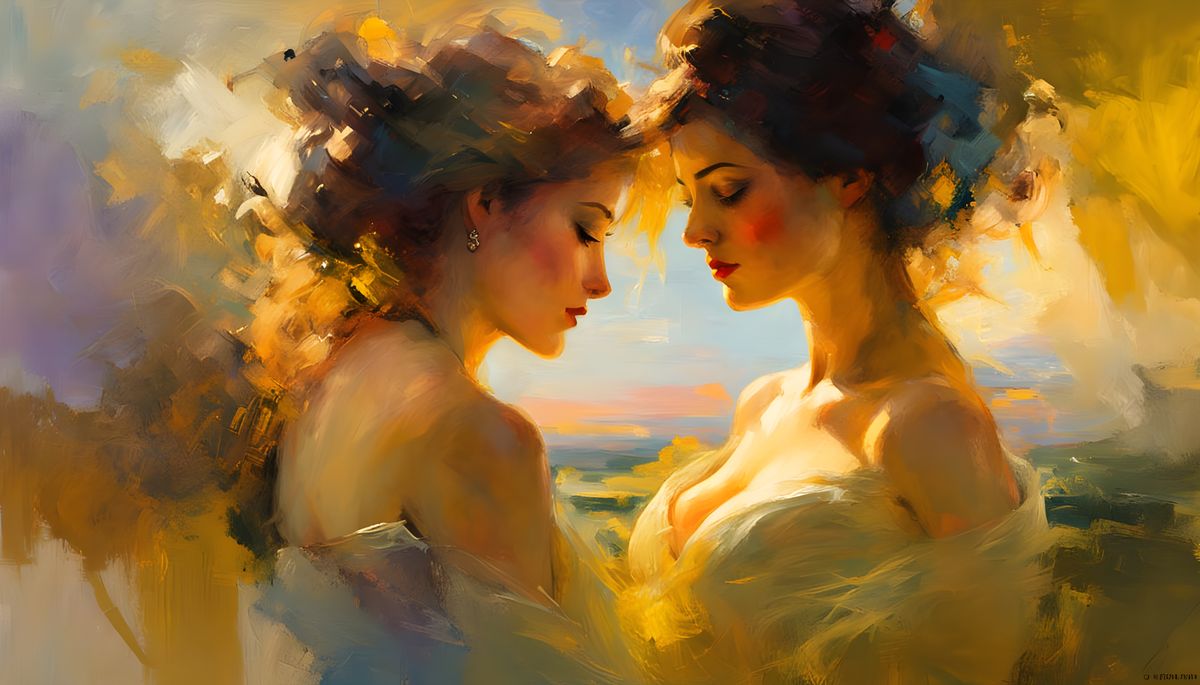This painting radiates a quiet intimacy, as two figures stand in mirrored postures, their foreheads nearly touching. The warm, golden light envelops them, softening the edges between self and other. Brushstrokes swirl with both energy and tenderness, suggesting a connection that is at once internal and shared—an exploration of identity, empathy, and the unspoken conversations between souls.