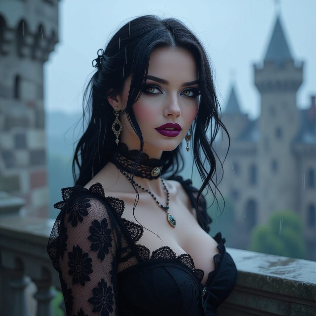A hyperrealistic image of a gothic woman with striking makeup and attire on a castle balcony. Rain and wind add drama to the scene, enhanced by steampunk metallic elements in a detailed, atmospheric style.