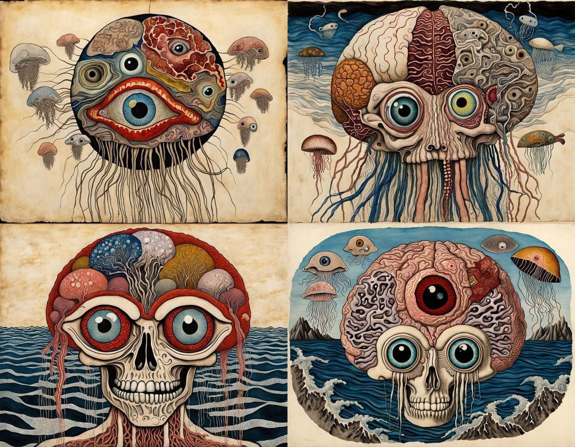 This image depicts bizarre sea creatures, including jellyfish and mutant organs, in a horrific scene. The artwork features mixed media elements with 3D effects and a collage aesthetic, reminiscent of layered paper and faded inks.