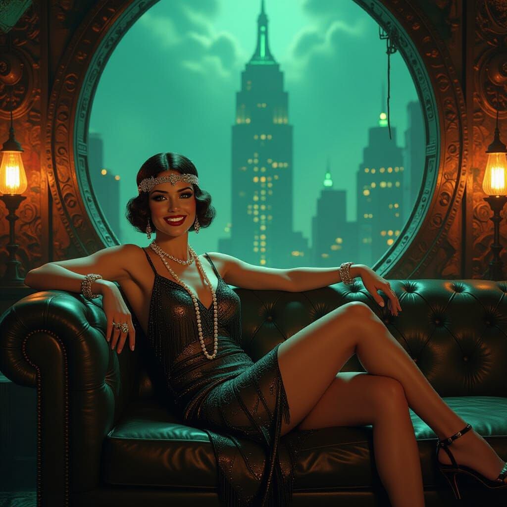 A striking picture of a female vault dweller in a flapper dress relaxing in a hidden speakeasy. The image is a maximalist digital painting with Art Nouveau elements.
