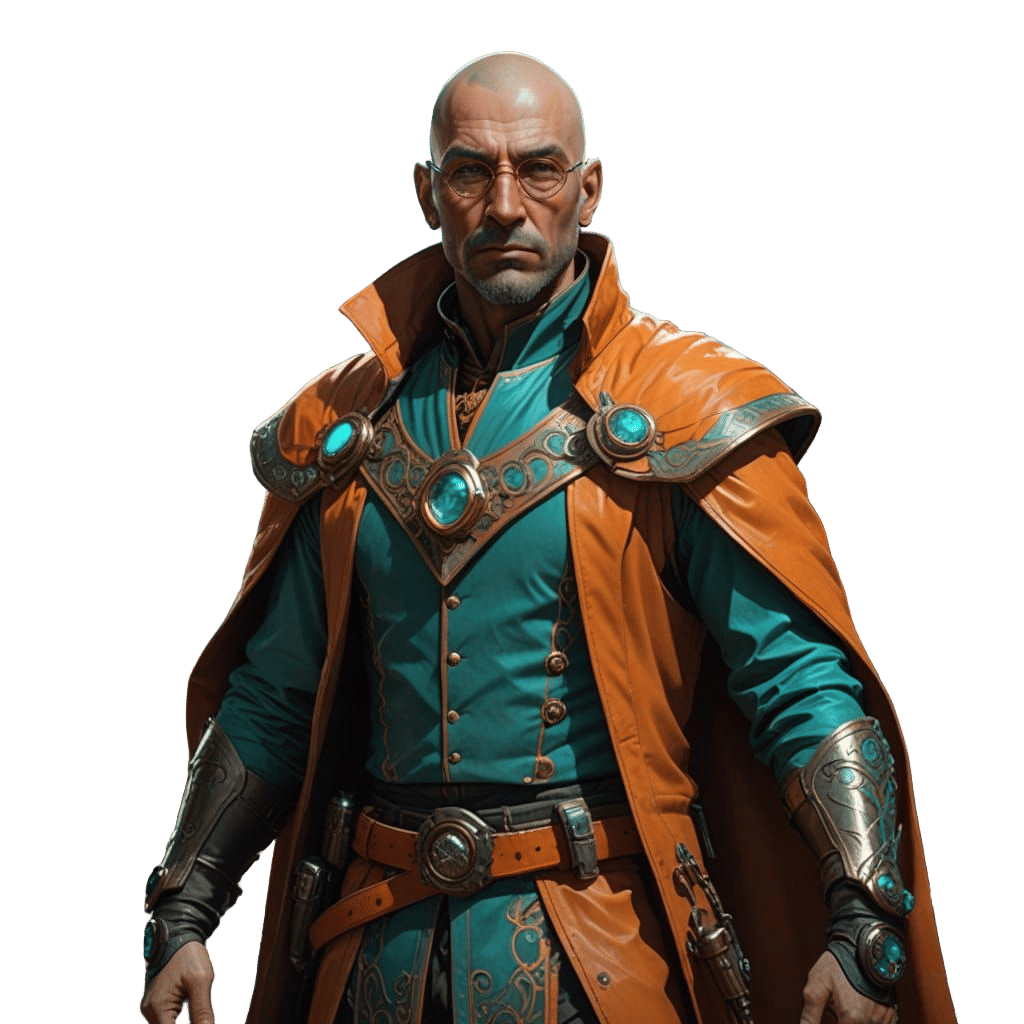 This image shows a bald male warrior with a stoic expression, wearing tight pants, a doublet, and small round glasses. The concept art features dynamic lighting, intricate details, and a vibrant orange and teal color scheme.