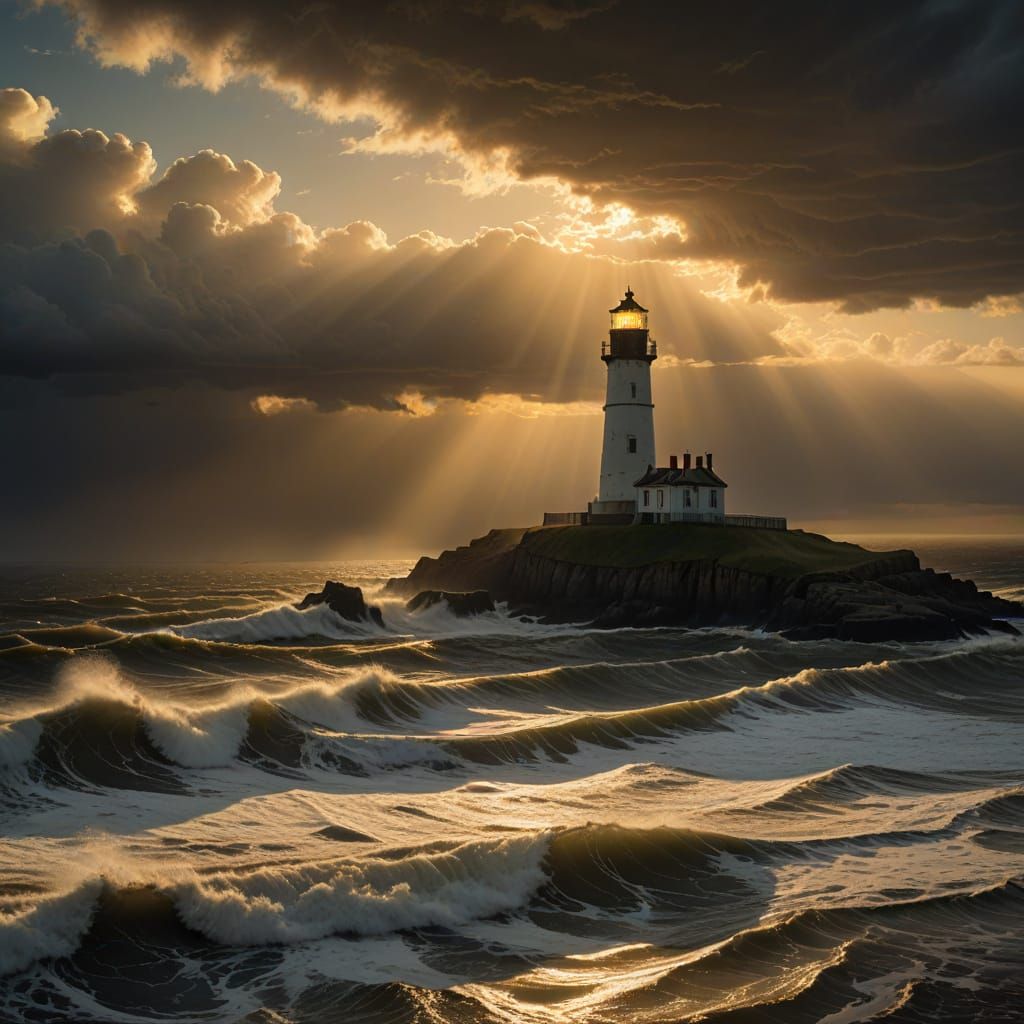 This image shows a moody seascape featuring a forsaken, storm-battered lighthouse illuminated by warm, golden light at dusk, evoking a Turner-esque style.