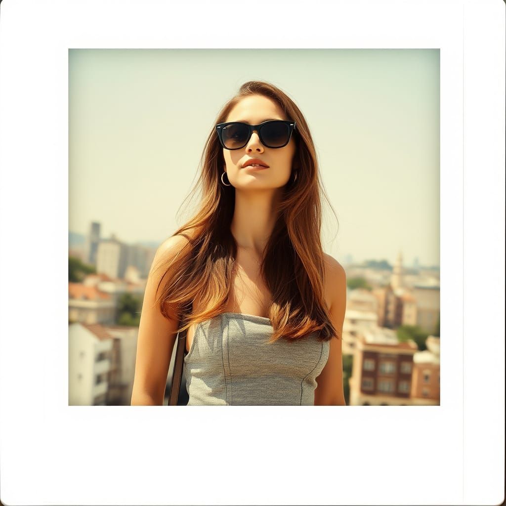 This image shows a vintage-style, hyperrealistic photograph of an Eastern woman in sunglasses and a dress, set against a cityscape. The art style uses sepia tones and isometric perspective.