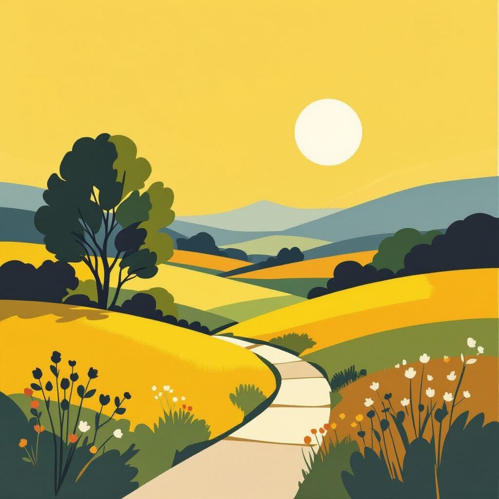 This image showcases a serene, sunlit abstract landscape. It features dominant yellow hues, simple geometric forms, and clean negative space, evoking quiet contemplation.