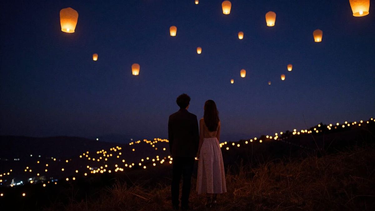 This image shows a couple on a hill releasing glowing lanterns into the night. Captured in a cinematic, romantic style with soft focus and warm hues, it evokes hope and love.