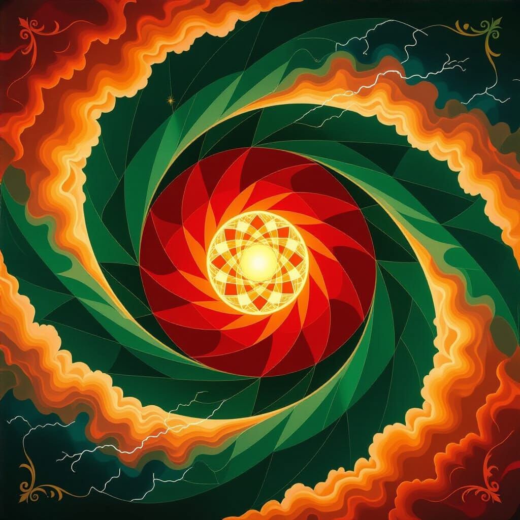 This image showcases a swirling deep red vortex holding a miniature sun with a warm glow. Abstract cosmic elements and golden stardust fill the scene, rendered with vibrant colors and a nebulous backdrop.
