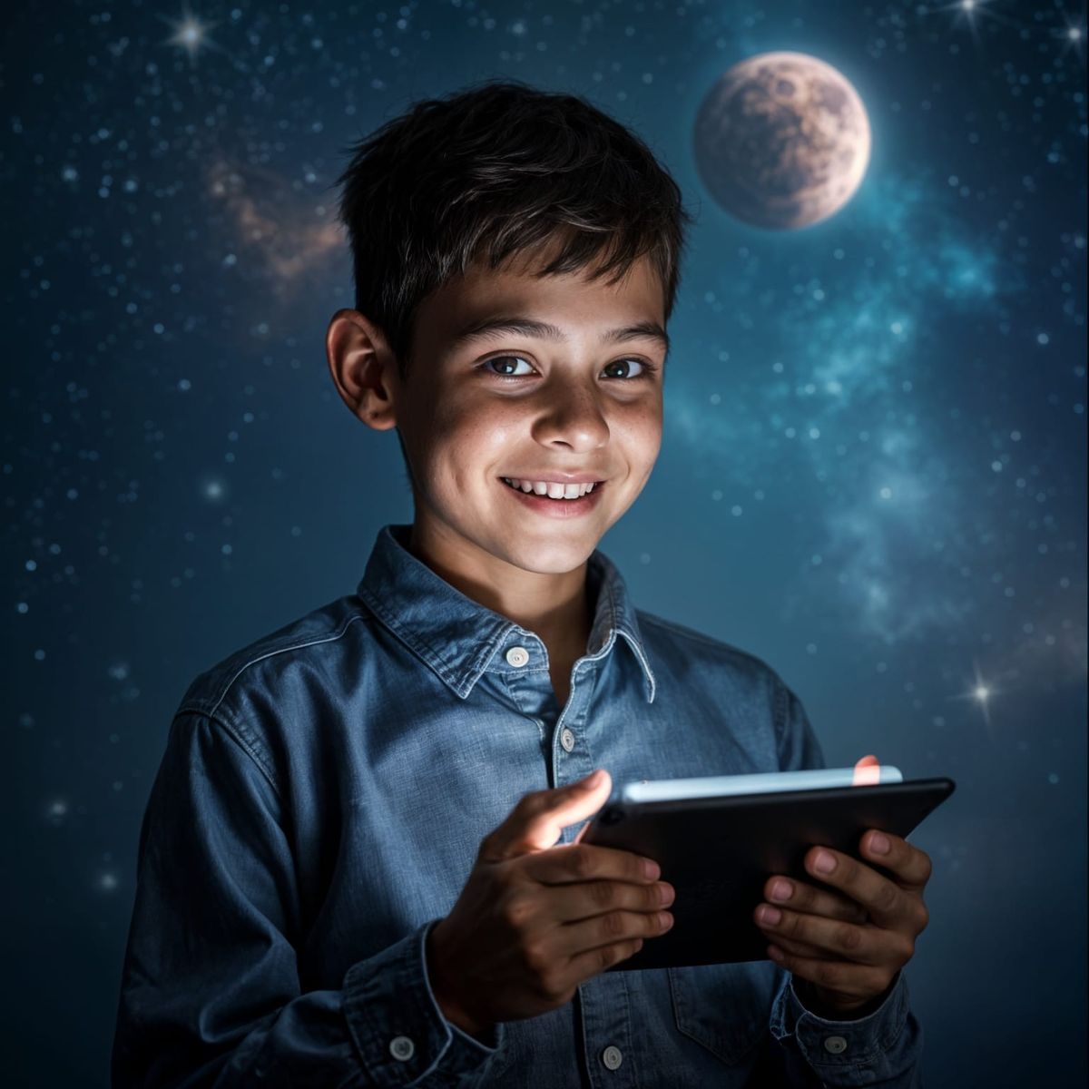 A photorealistic portrait of a smiling 14-year-old boy holding a tablet, with a vibrant planet and stars in the background. Cinematic lighting enhances the scene.