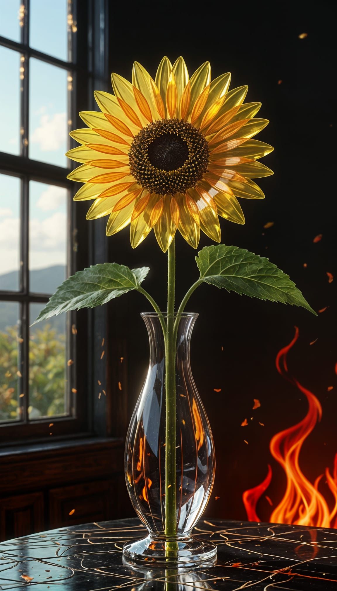 This image shows a surreal crystal sunflower in a vase. The transparent flower faces the camera. The backdrop is a dreamlike room with black and red walls and a dark, starless sky, in a digital matte painting style.