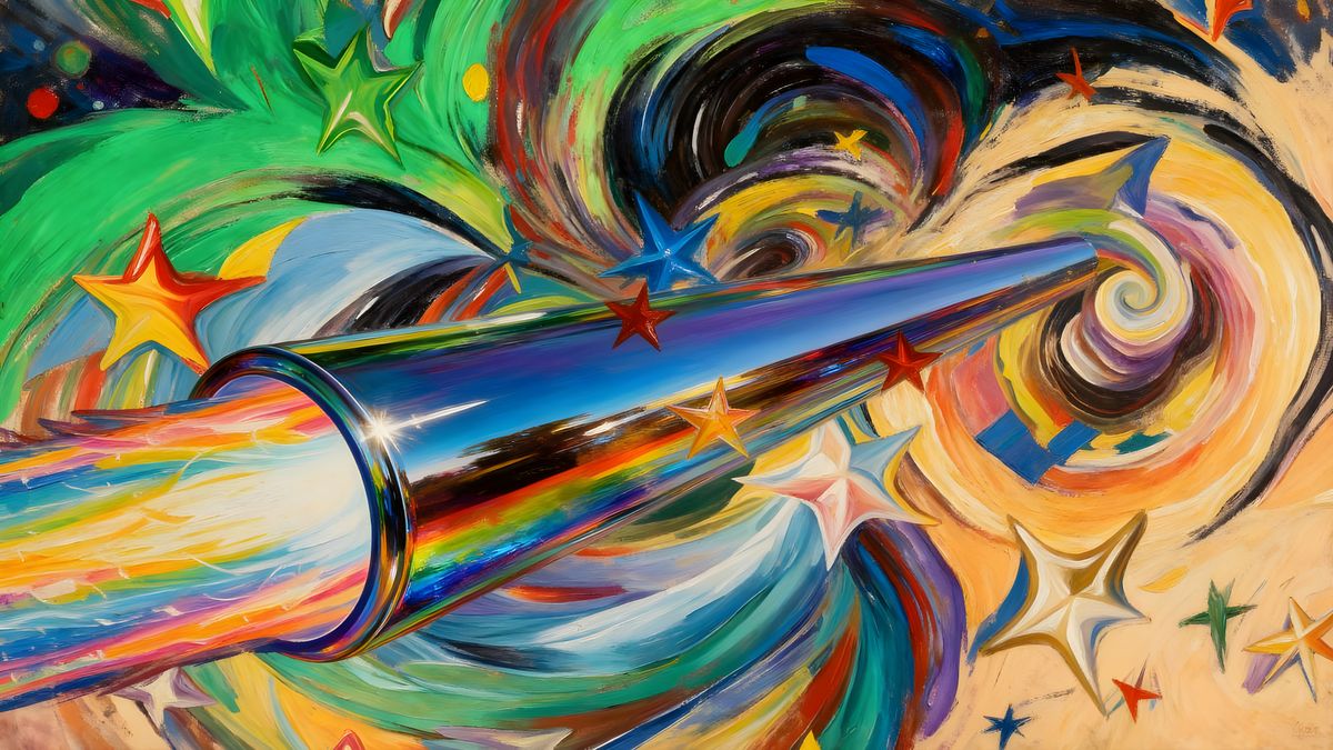 A striking image of a sleek, hollow rainbow cylinder with a high-velocity exhaust, set against a backdrop of a deep 3D vortex. Rendered in a dynamic, textured impasto oil paint style with bold, clashing colors.